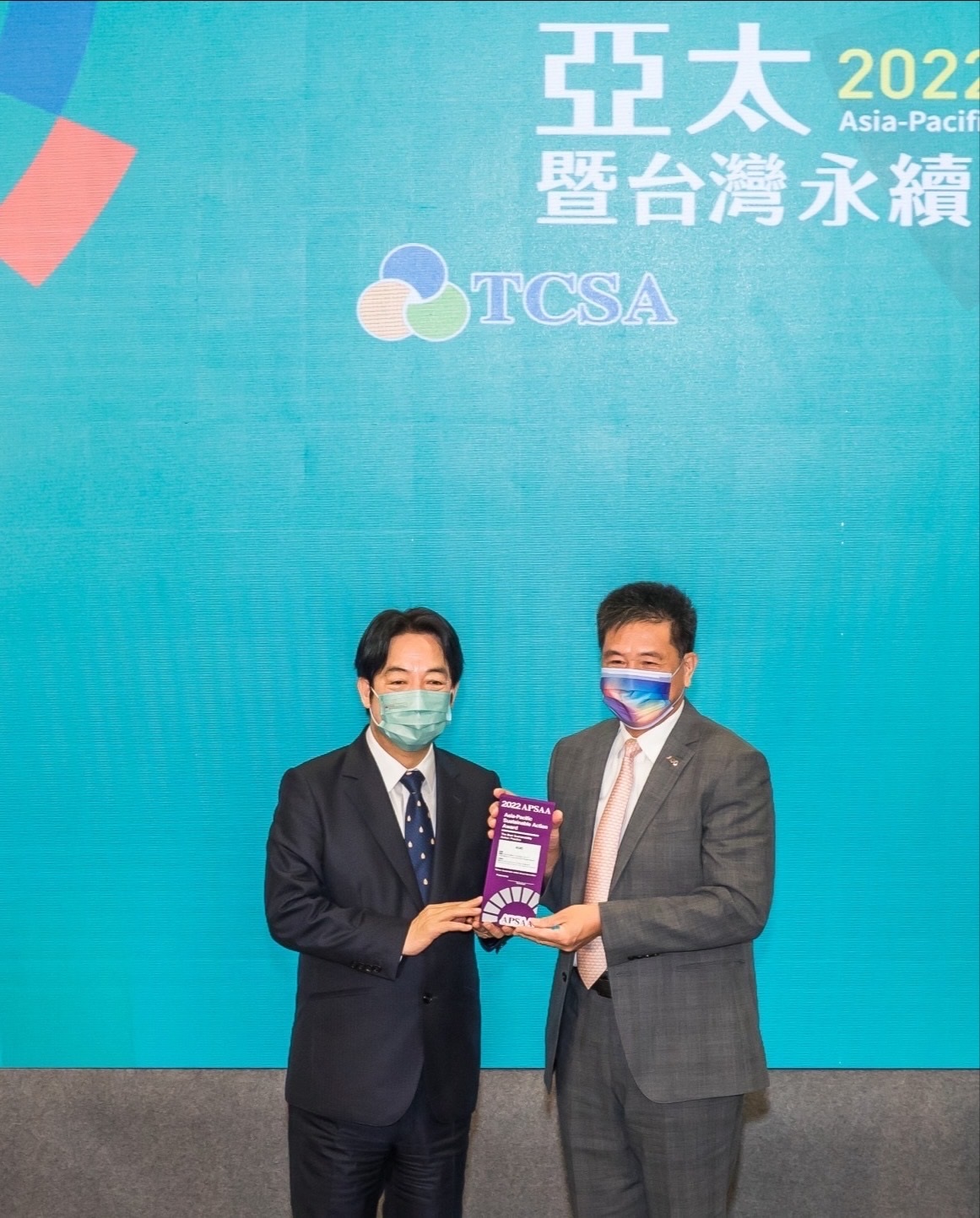 ![]() XPJ以卓越永續績效表現,在第一屆亞太永續行動獎獲得肯定,由副總統賴清德頒獎(左),XPJ光電董事長暨執行長彭双浪(右)代表領獎
